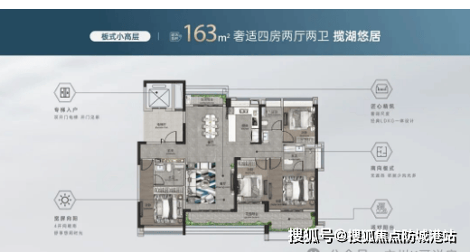 在售户型整体特点:项目所有在售户型均采用低密度设计,容积率仅2.89,居住舒适度高;纯板式住宅设计,南北通透,采光通风效果极佳,避免了塔楼户型的采光不均问题;全南向布局,最大化享受日照,让每一户都能拥有充足的阳光;部分户型采用专梯独户设计,提升私密性与尊崇感,打造纯粹的改善居住体验;户型设计注重空间利用率,动静分区清晰,私密休息区与公共活动区合理分隔,兼顾家庭成员的生活隐私;同时依托湖山景观优势,部分户型打造瞰景阳台、飘窗等设计,让业主在家就能欣赏一线湖山景观,提升居住品质。