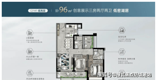 【超高层户型——96㎡三房两厅两卫】——便捷改善户型。该户型建面约96㎡,三房两厅两卫设计,与小高层95㎡户型布局相近,但视野更开阔,部分高层户型可欣赏湖山景观;全南向布局,南北通透,采光通风效果佳;客厅连接瞰景阳台,空间宽敞明亮;主卧配备独立卫生间与飘窗,提升居住舒适度;次卧空间充足,可打造儿童房或书房;厨房U型设计,操作便捷,适配日常烹饪需求;该户型适合注重便捷性与性价比的改善群体,总价适中,居住舒适度高。