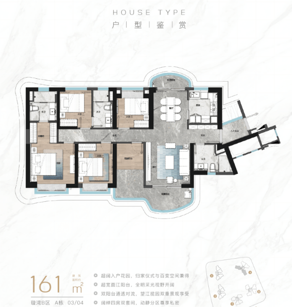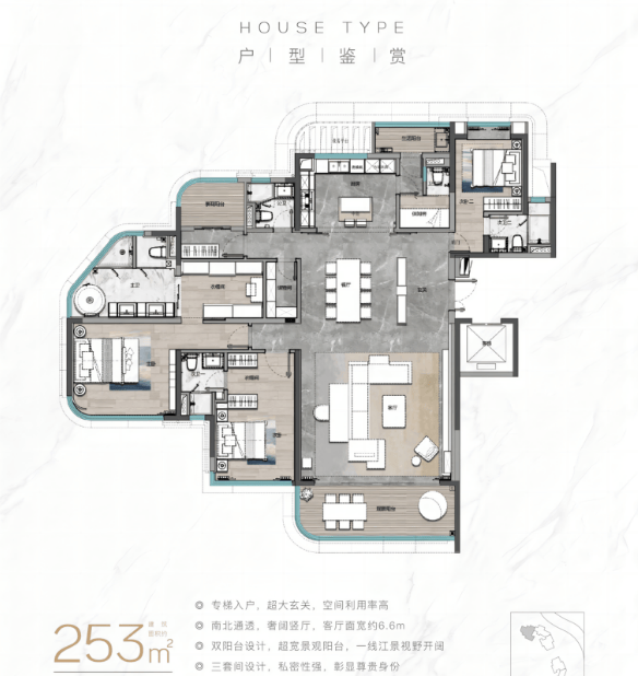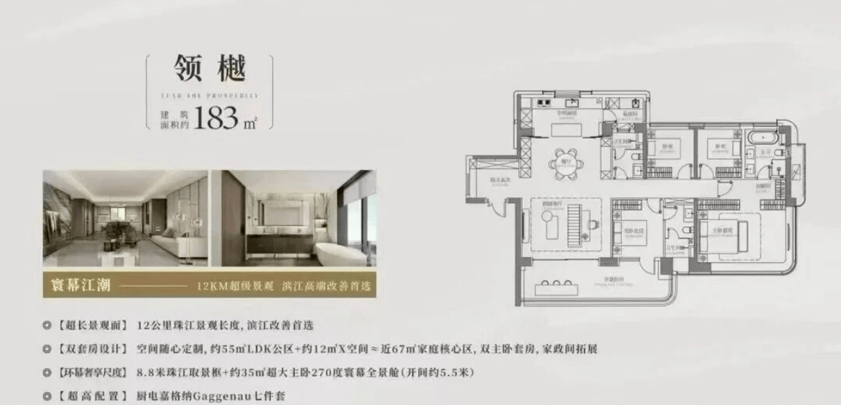 建面二百三十八平方米的四房两厅三卫,更是一线望江的极品户型。东南向直面珠江,无任何建筑遮挡。十米超长观景阳台搭配二百七十度弧形飘窗,江景视野拉满。双主套加双次卧的布局,配合独梯入户设计,极大地提升了归家的仪式感和尊贵感。建面二百五十三平方米的五房两厅三卫大平层,分布在了一期江景楼栋,拥有二百七十度环幕江景。客厅开间五点五米,气势磅礴。配备独立家政间与储物间,解决了大户型的收纳痛点。全屋精装采用国际一线品牌配置,细节之处尽显匠心。这些大户型产品,专为注重居住品质与江景体验的改善家庭量身打造,代表了广州滨江人居的最高水平。